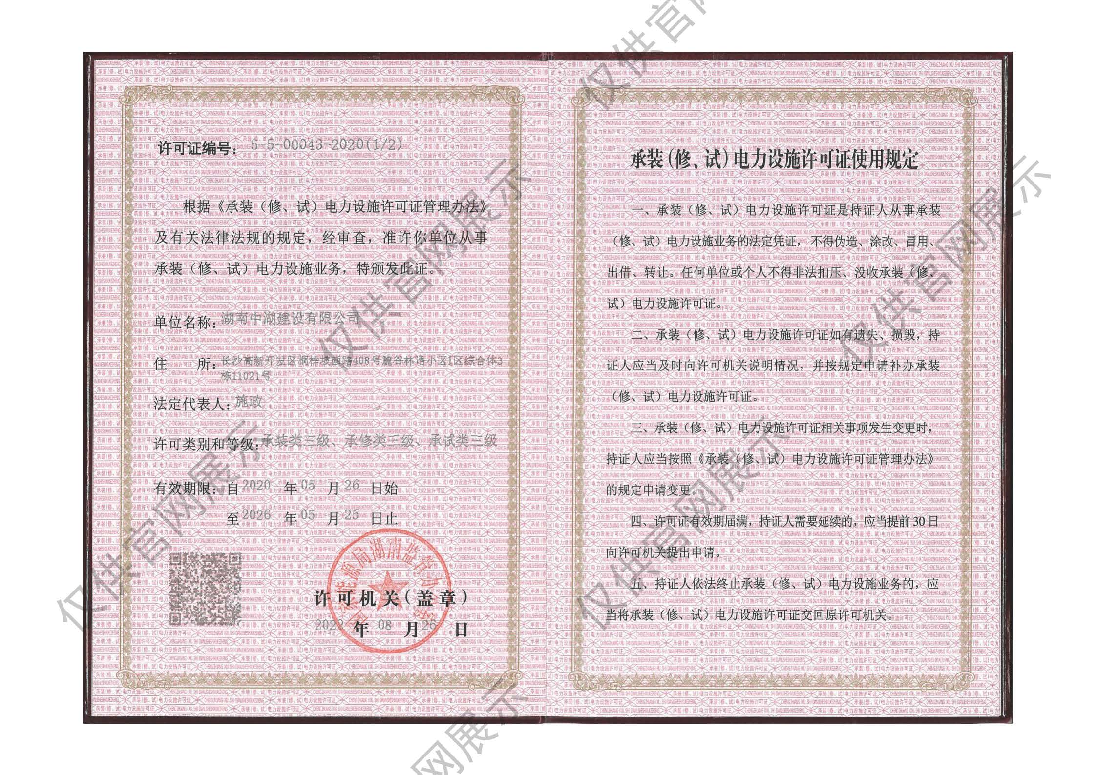 中湖建設(shè)承裝(修、試)電力設(shè)施許可證三級(jí)